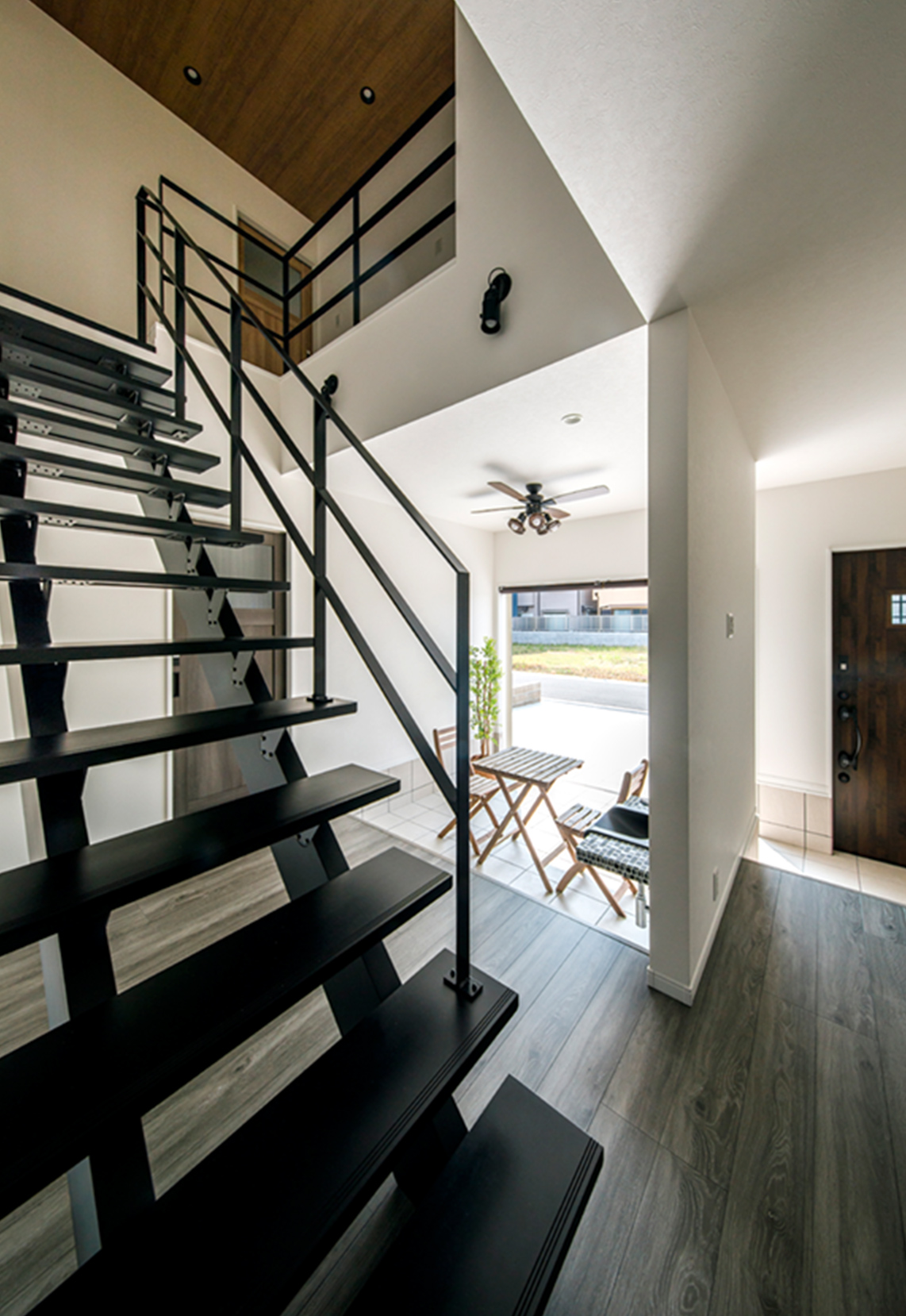 抜け感良いスケルトン階段なので土間空間を圧迫することなくむしろ土間のインテリアの一部として成り立たせました。
